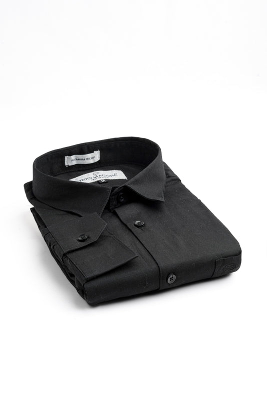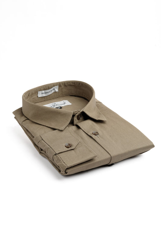 - Spread collar and long sleeves with buttoned cuffs.