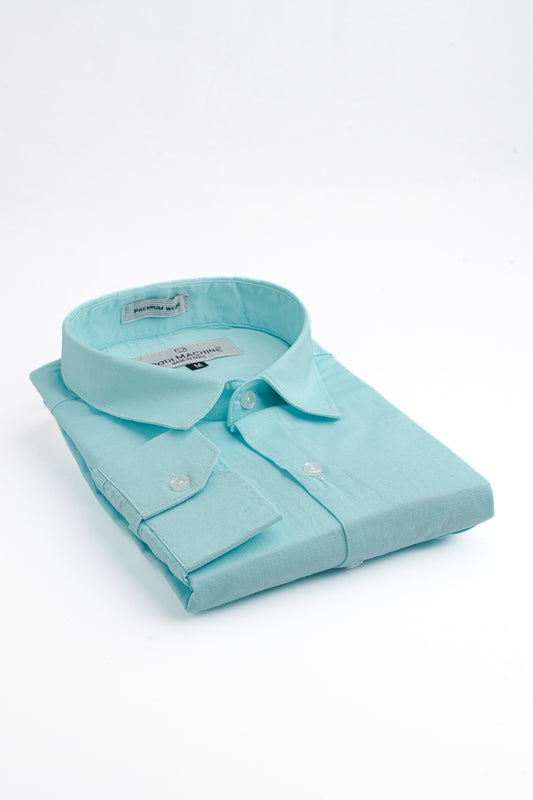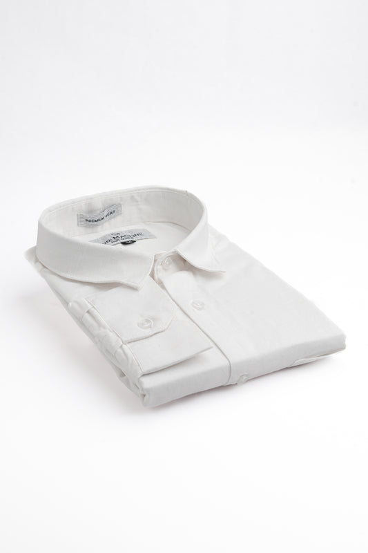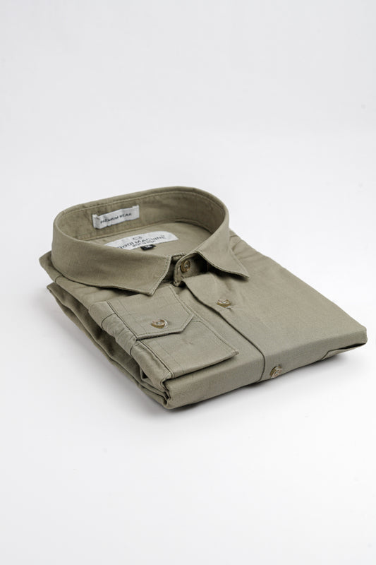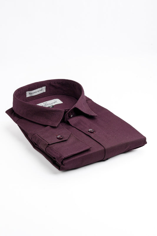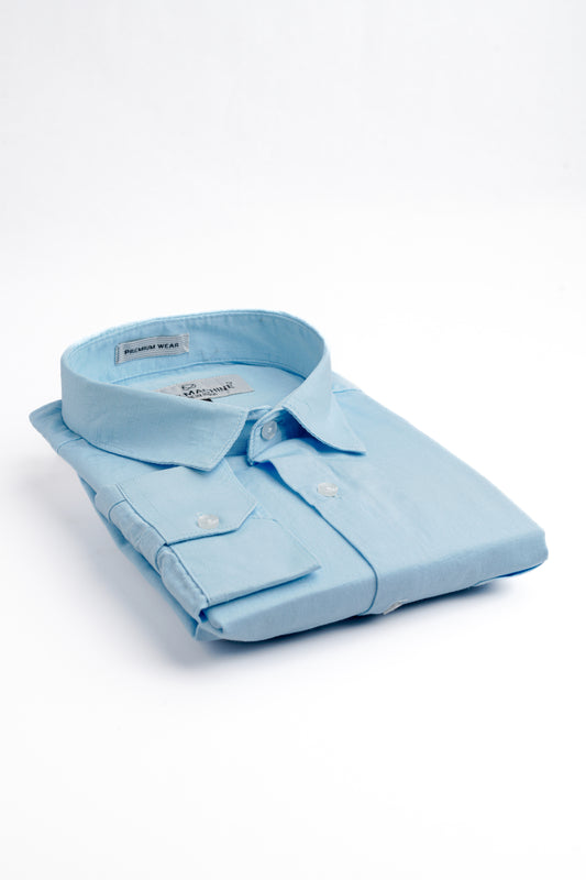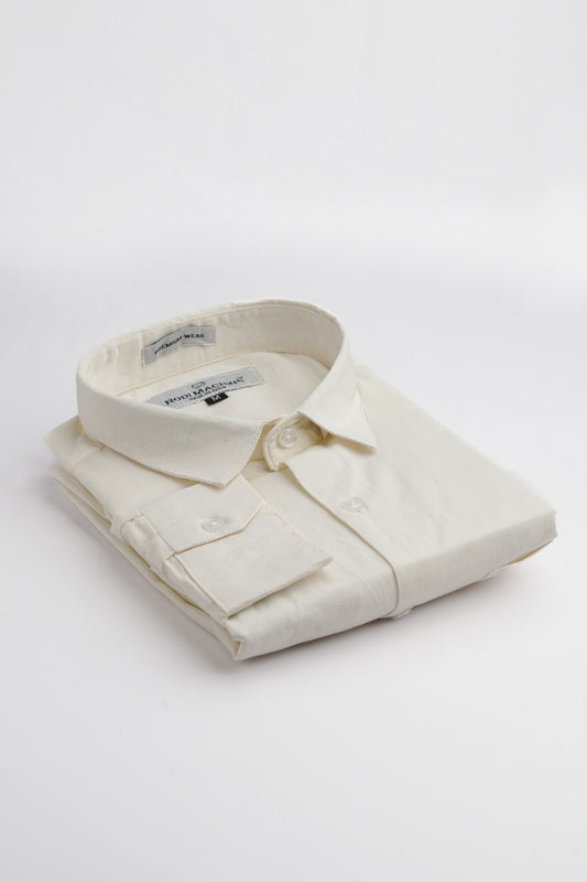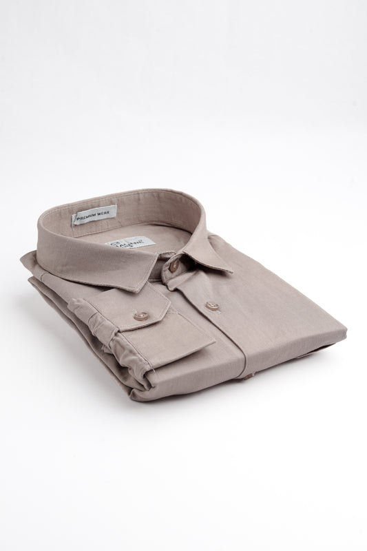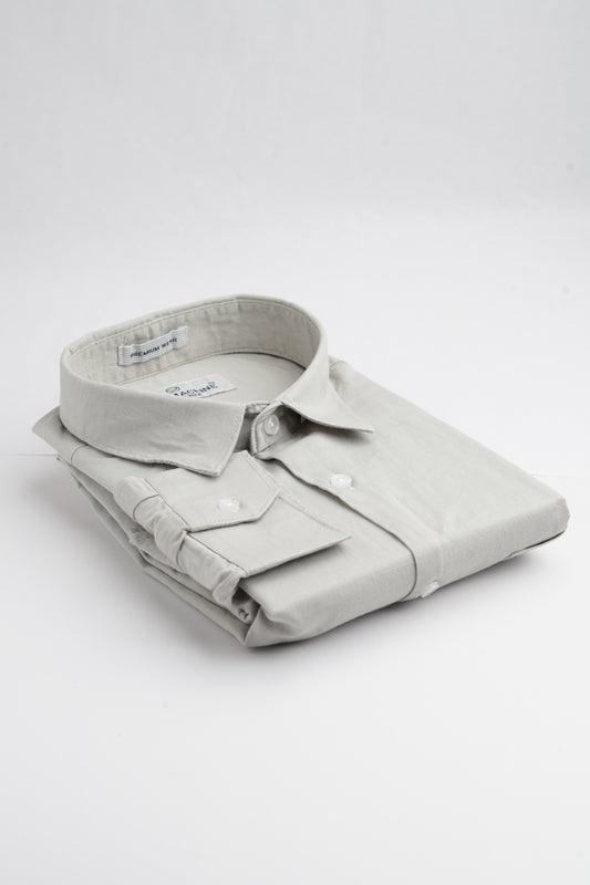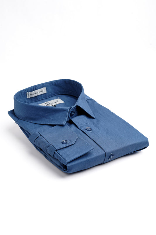 - Spread collar and long sleeves with buttoned cuffs.